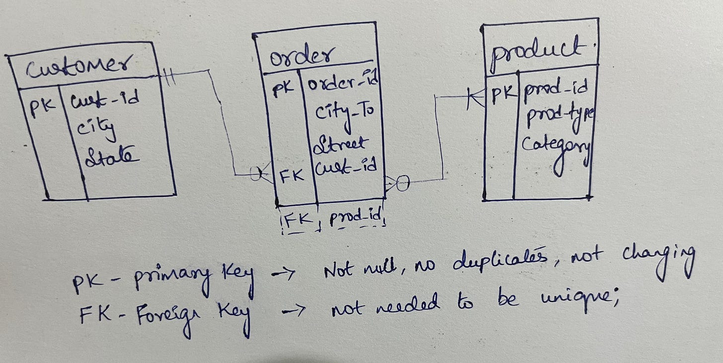 Relationship: A relationship is a connection between entities that represents how they interact with each other. For example, a relationship between a customer and an order might be that a customer can place many orders, but each order is placed by only one customer.